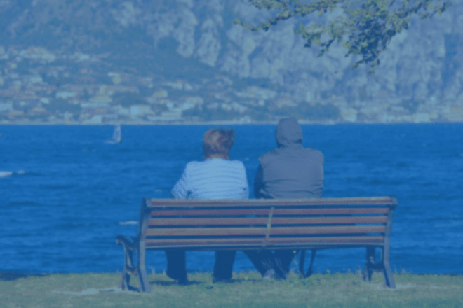 Previdência 01-min Casal idoso sentado em um banco de praça publica, admirando a imagem de um grande e belo lago. Ao fundo aparece a imagem de uma comunidade instalado às margens do lago.