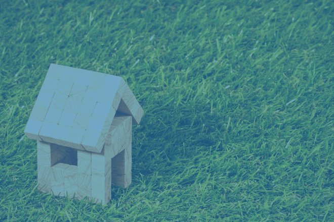 Gramado verde com miniatura de asa construída com blocos de madeira.